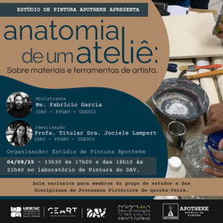 ![]() Encontro Arte na Escola Polo UFSCEm 2019.1 o Estúdio de Pintura Apotheke encontrou o Grupo de Estudos do Polo Arte na Escola da UFSC. Nesse encontro, a professora Dra. Jociele Lampert apresentou suas pesquisas sobre ser artista professor e o lugar do estúdio de pintura como um laboratório de ensino e aprendizagem. |